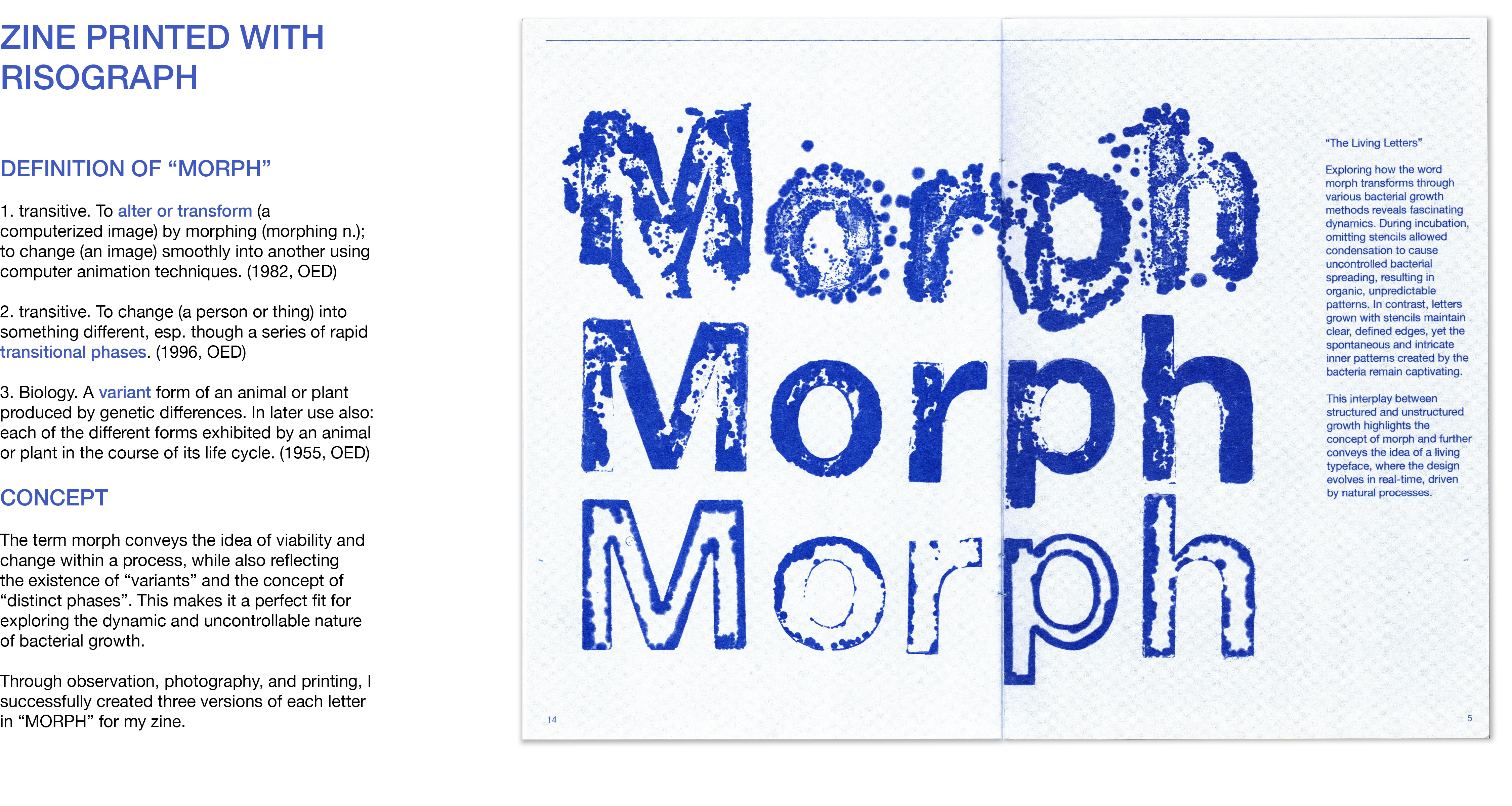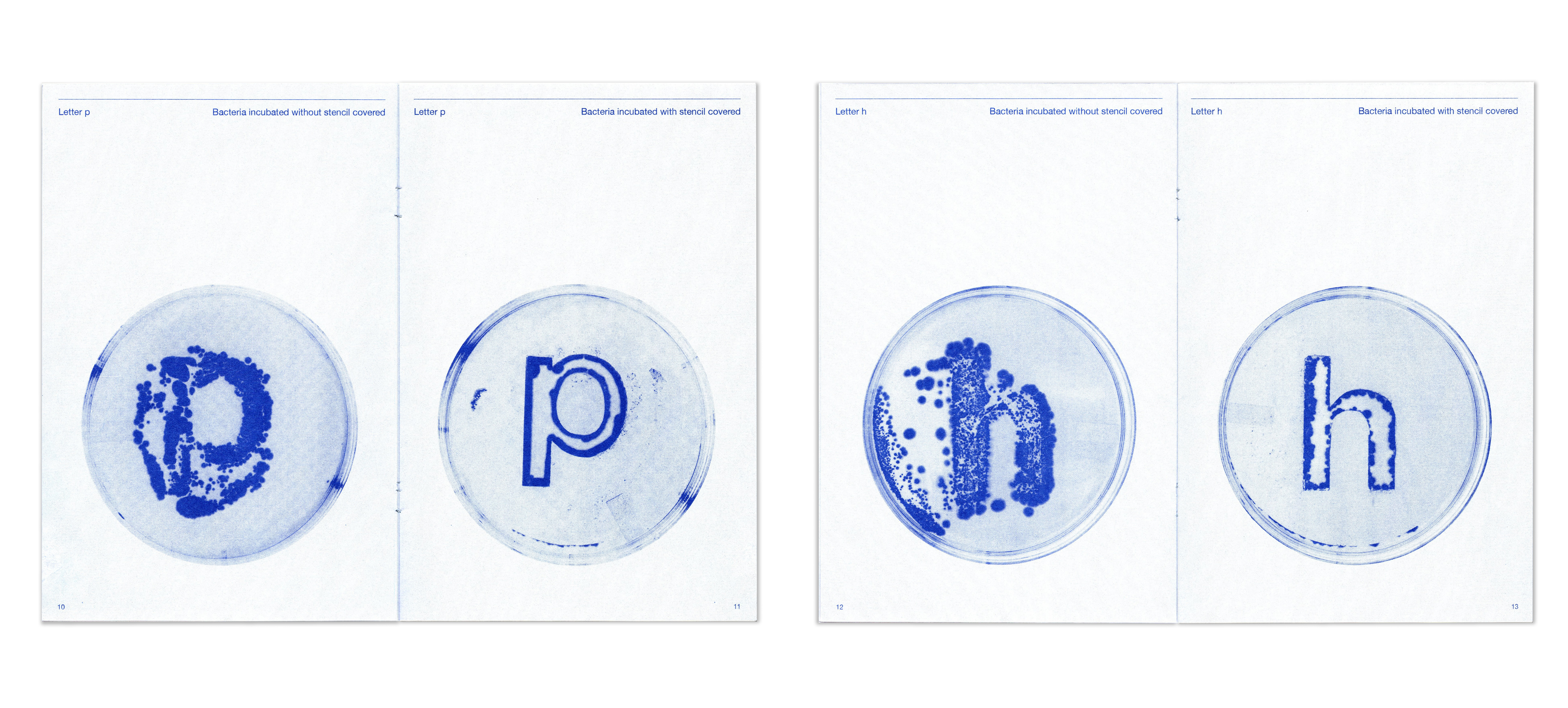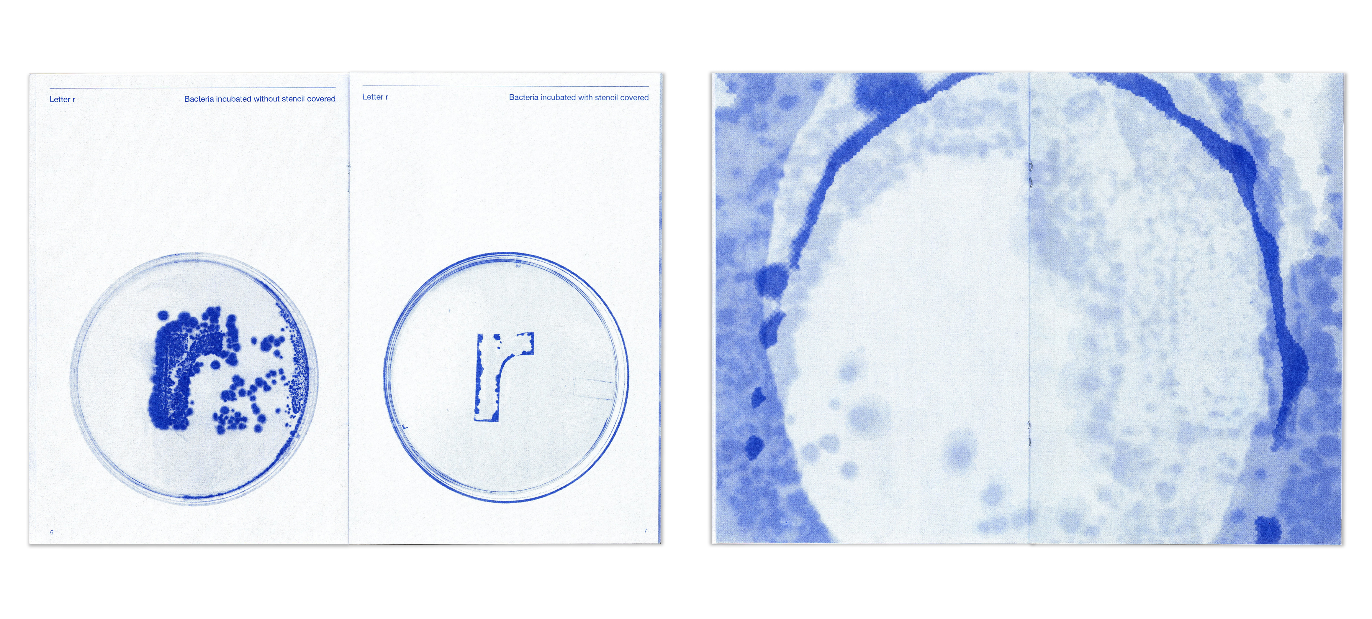 While technological advancements have made everything increasingly precise and static, I find inspiration in the unpredictability of using bacteria in printmaking. This process introduces a living, evolving quality that brings emotional depth to both language and form. My exploration focused on cultivating bacterial growth through the practice of bacteria painting, observing how letterforms emerged, shifted, and transformed over time. I documented the process through a series of experimental prints and compiled the outcomes into a risograph-printed zine.